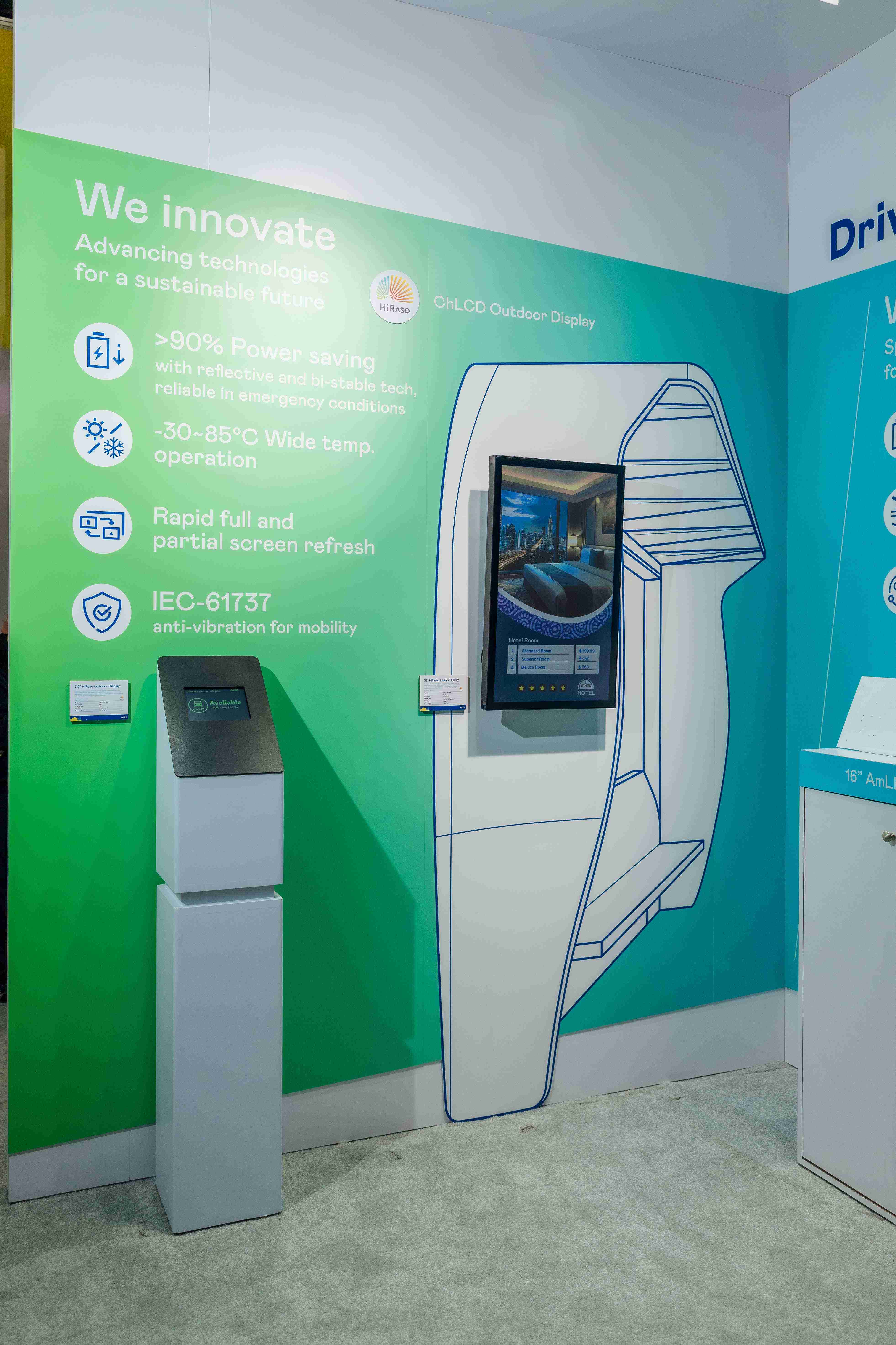HiRaso胆固醇液晶显示器运用反射环境光线的方式,,,呈现影像显示时零耗能的环保省电诉求,,,光线愈强愈能呈现绝佳的色彩饱和度及显示效果,,同时在摄氏-30度至85度间宽温的使用优势,,为户外电子看板的新首选。。