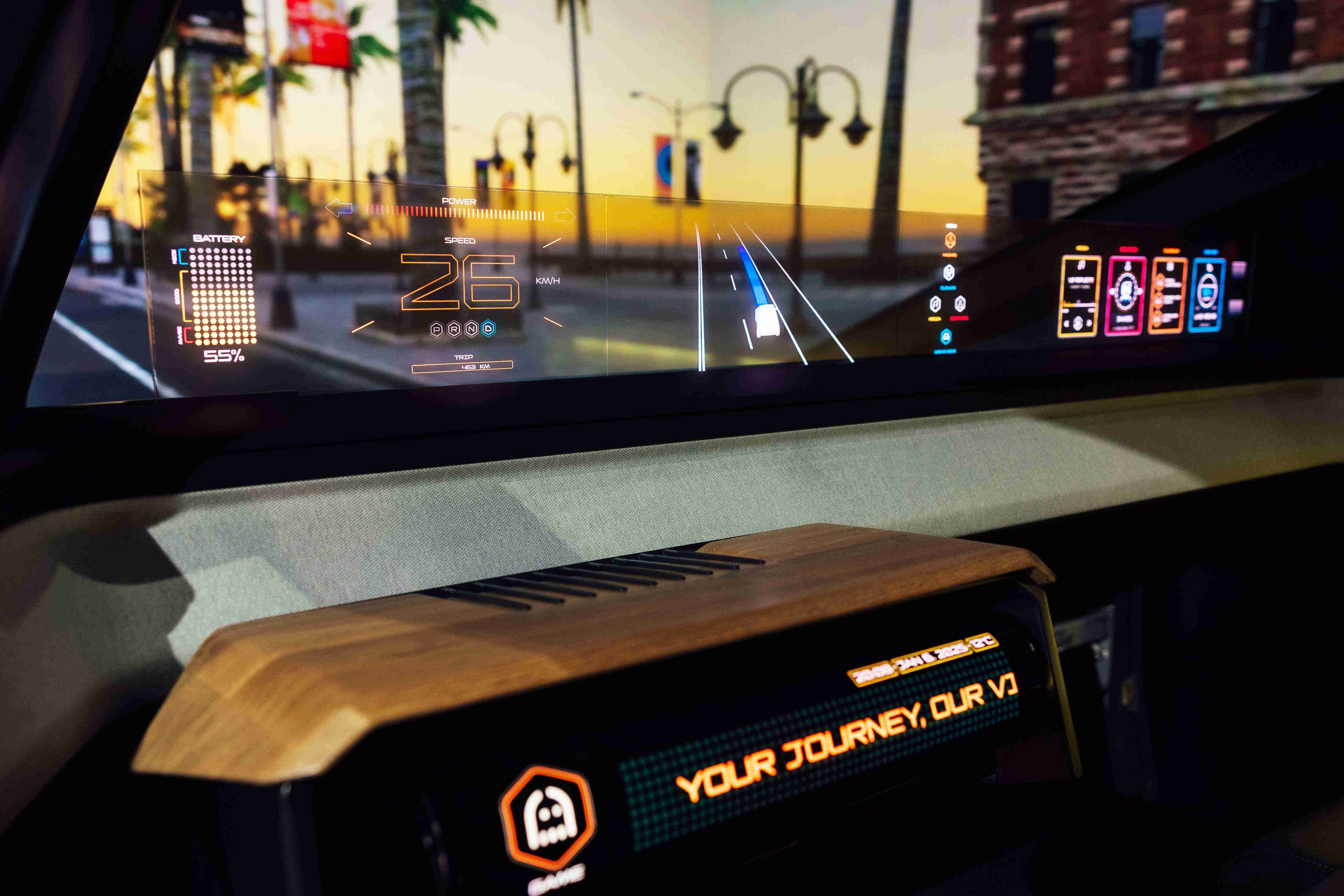 车用运算方案驱动无界透明显示介面(Horizon Image Glass),,,,整合仪表板、、、、中控及副驾显示功能为一体式全景呈现,,,,不仅提供清晰的外部视野,,,,亦能即时显示车辆状态、、、、导航及路况资讯,,并赋予个性化设定与驾驶安全警示等加值化服务。。。。