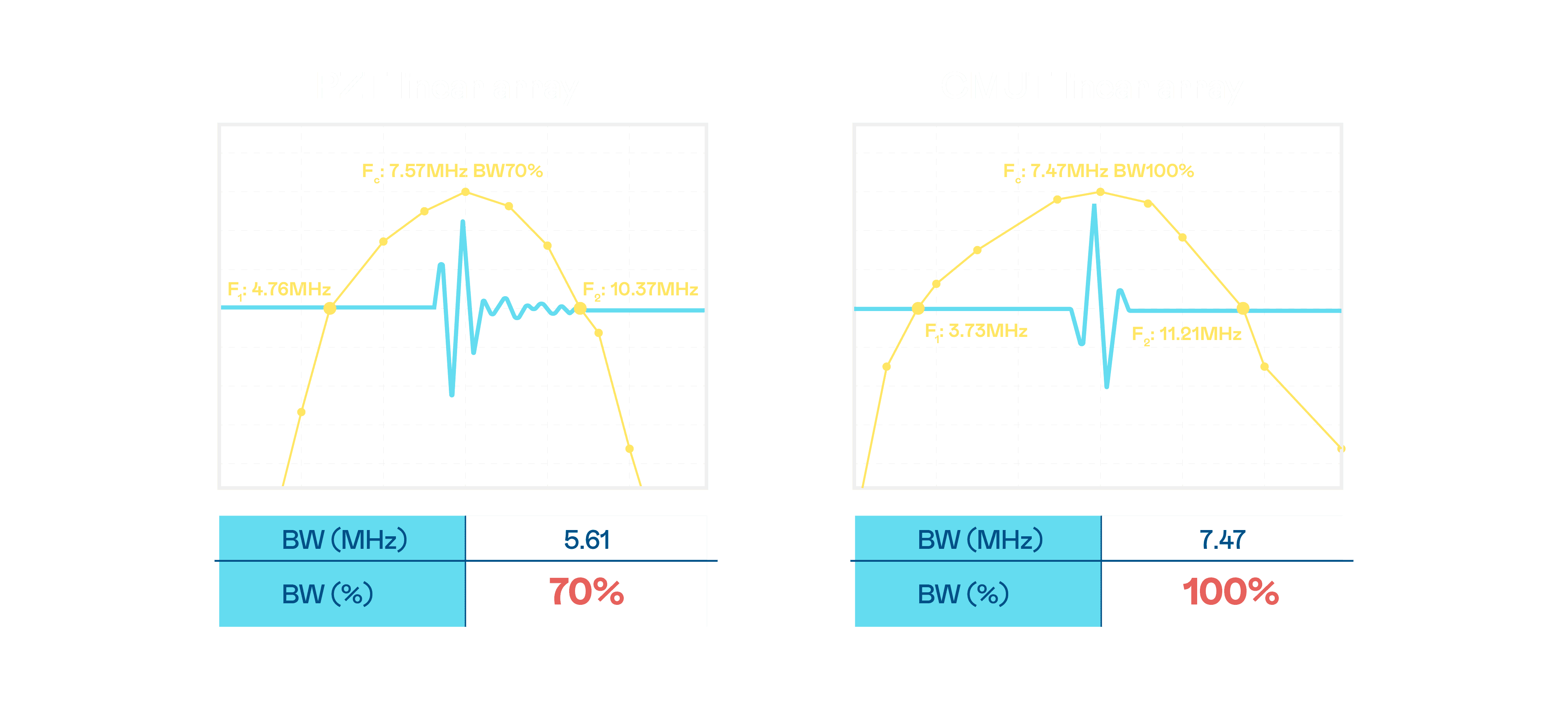 超音波影像的解析度高低,,首先取决于探头能发出的讯号频宽。。。。尊龙z6 CMUT 可提供高清晰的超音波讯号,,提供高频宽、、、高灵敏度、、影像纹理细节更高的超音波影像,,协助医护人员缩短影像判读时间及利用精准的医疗影像进行诊断。。。